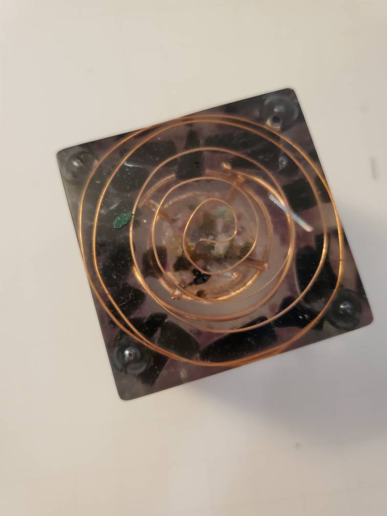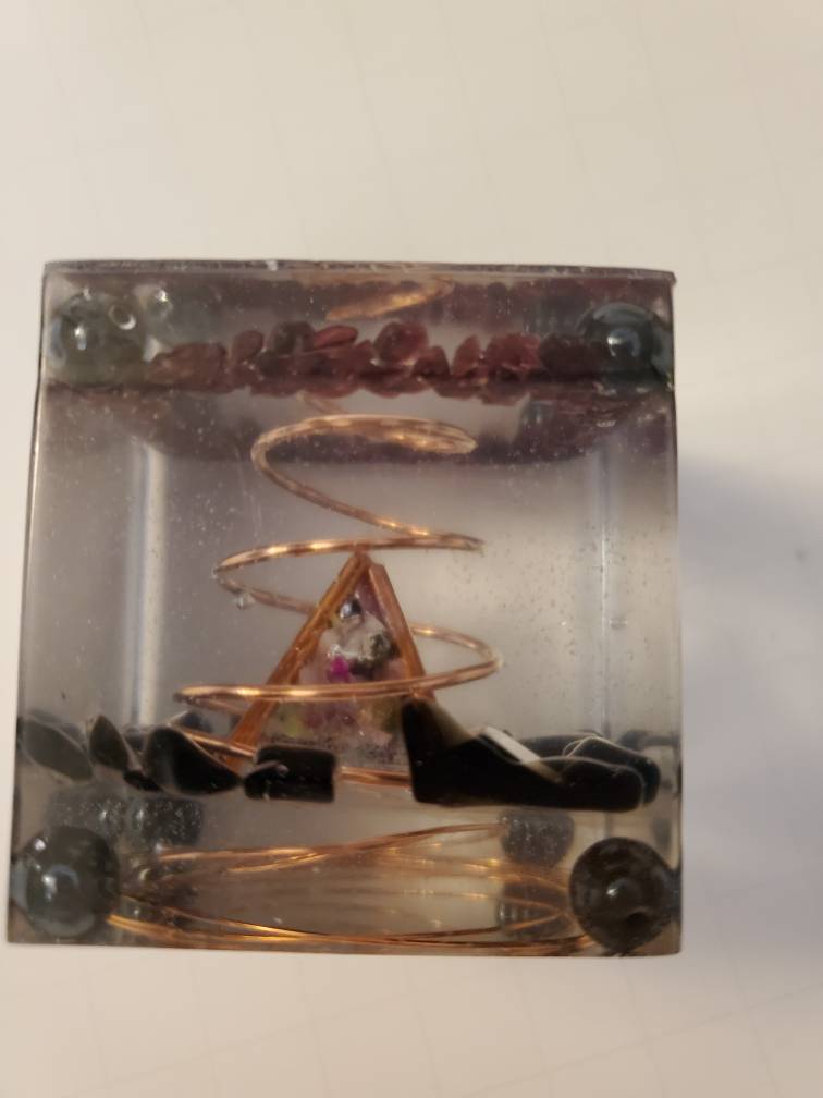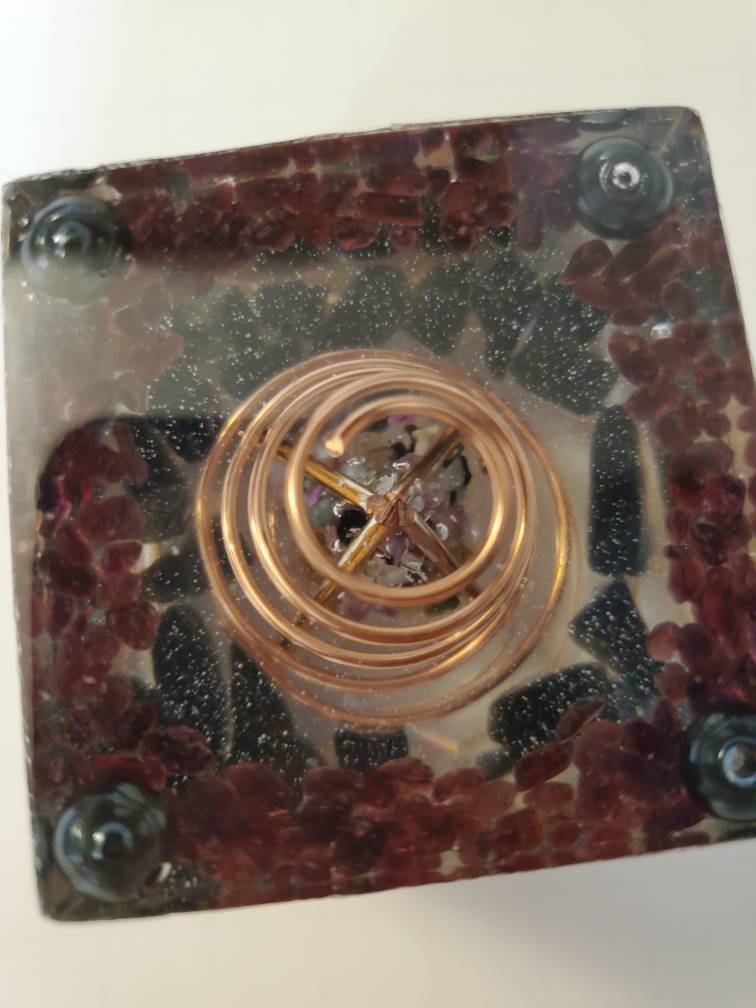 This handcrafted energy harmonizer cube is cast in clear, high-gloss resin to preserve and amplify its intricate inner matrix. At its core sits a coiled copper vortex paired with a small resin-cast pyramid that focuses and directs the flow of energy. Surrounding this spiral-and-pyramid assembly are black tourmaline stones for grounding and red garnet crystals. Garnets embody the earth element while acting like high-density batteries—storing and releasing more energy per volume than most stones. Natural resin bubbles catch light and enhance multidimensional resonance. The cube’s compact form makes it ideal for personal energy clearing, altar focal points, or as a portable grid anchor.